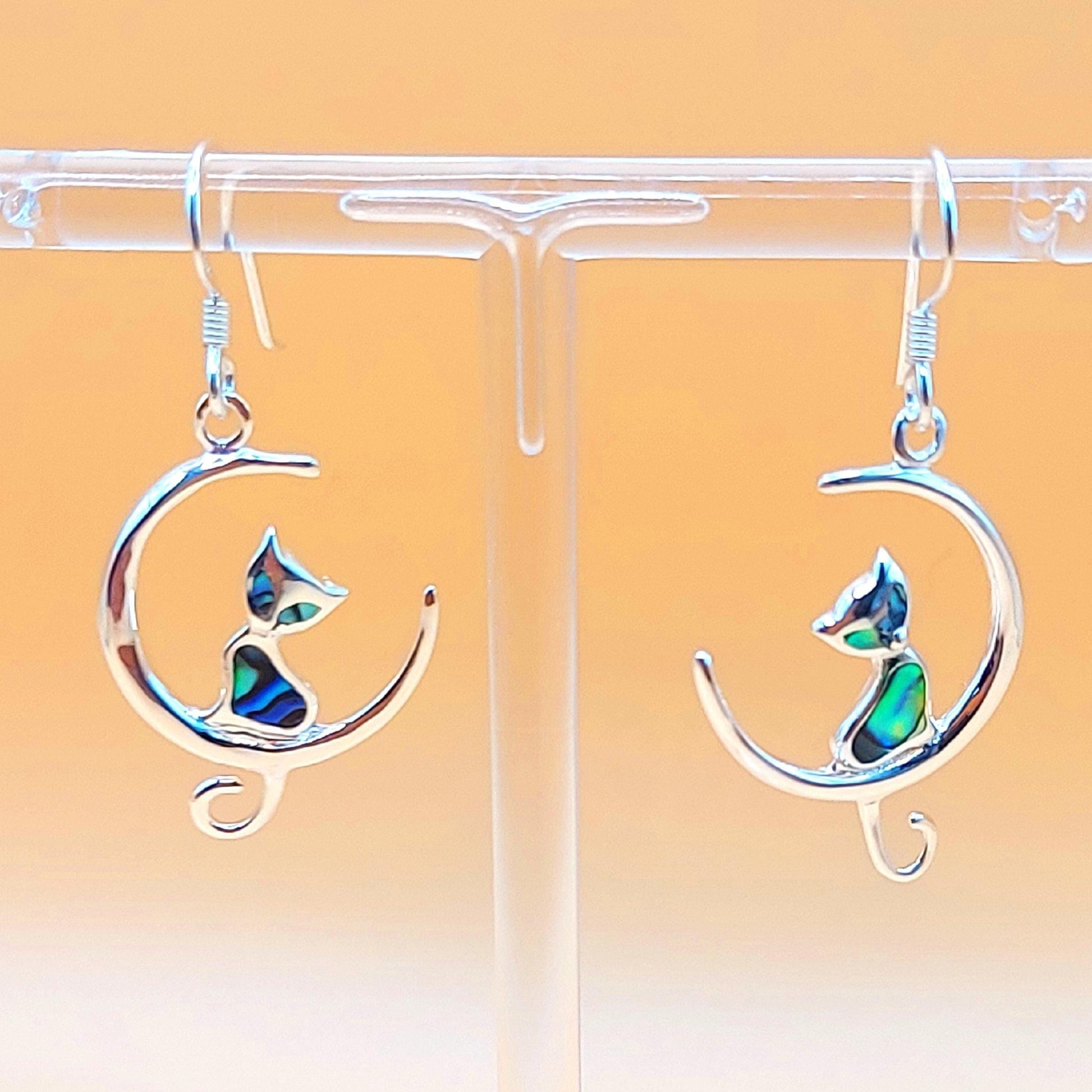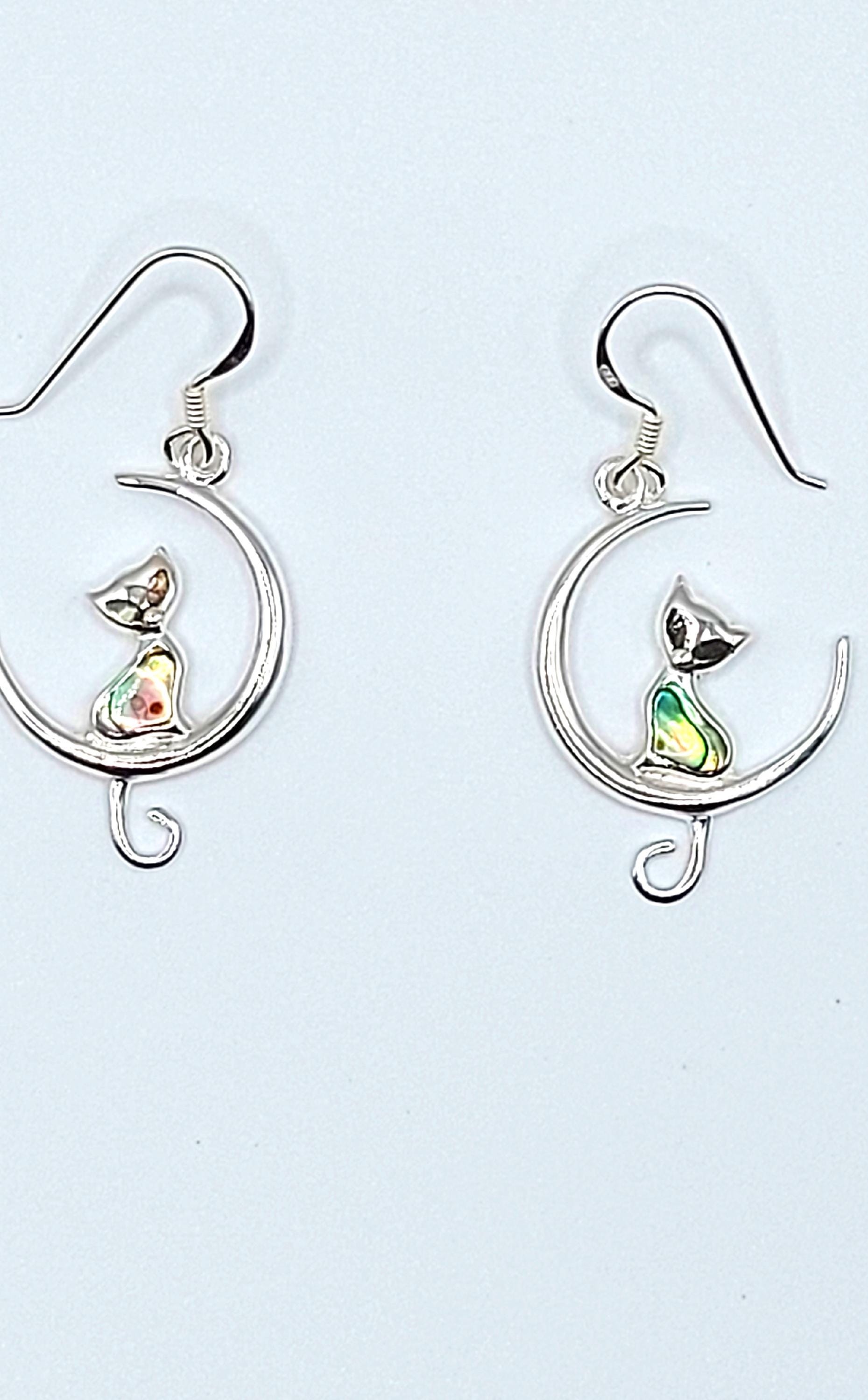 Silver Handmade Inlay Earrings Semi Precious Abalone Shell- Cat on Moon