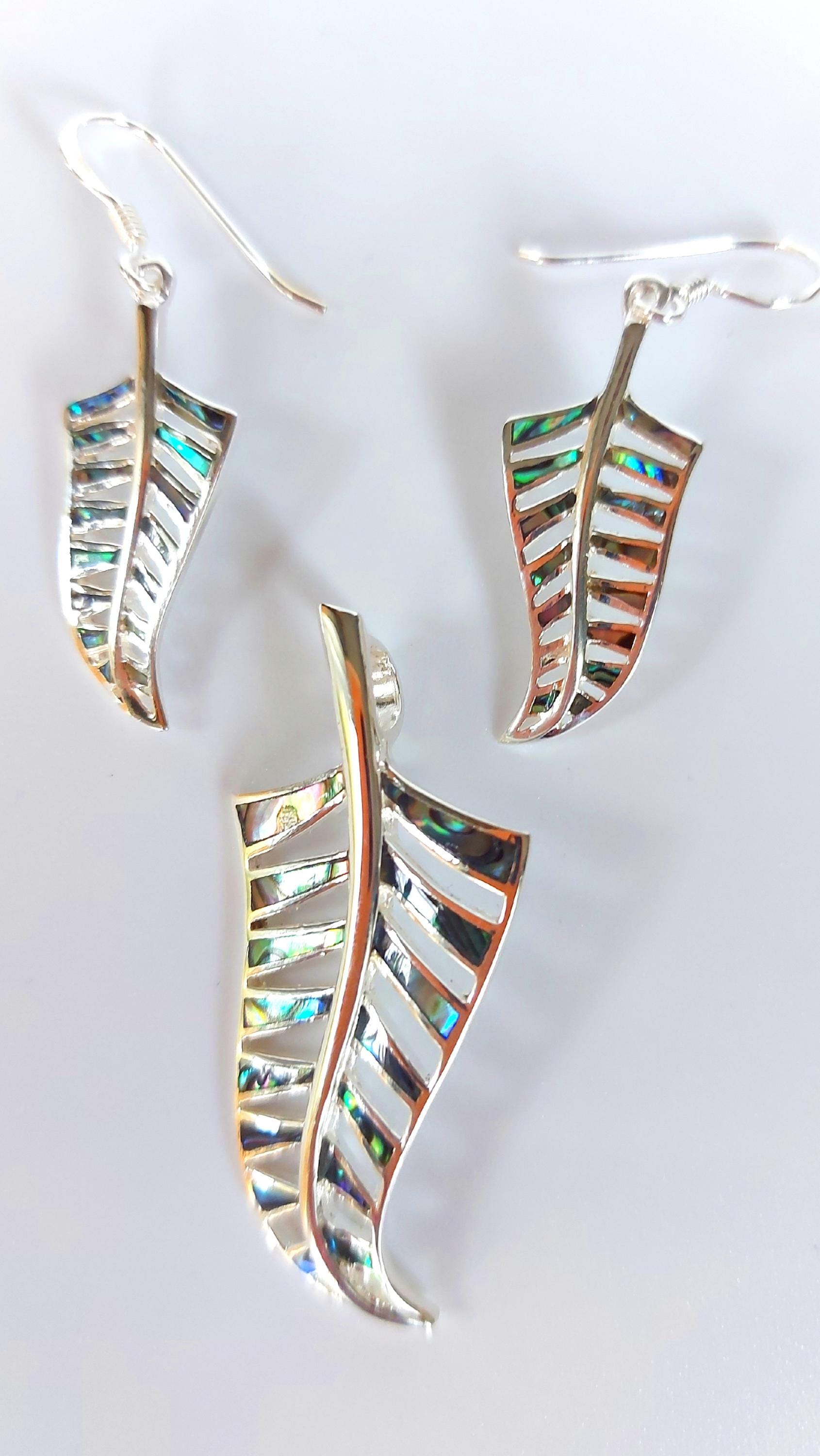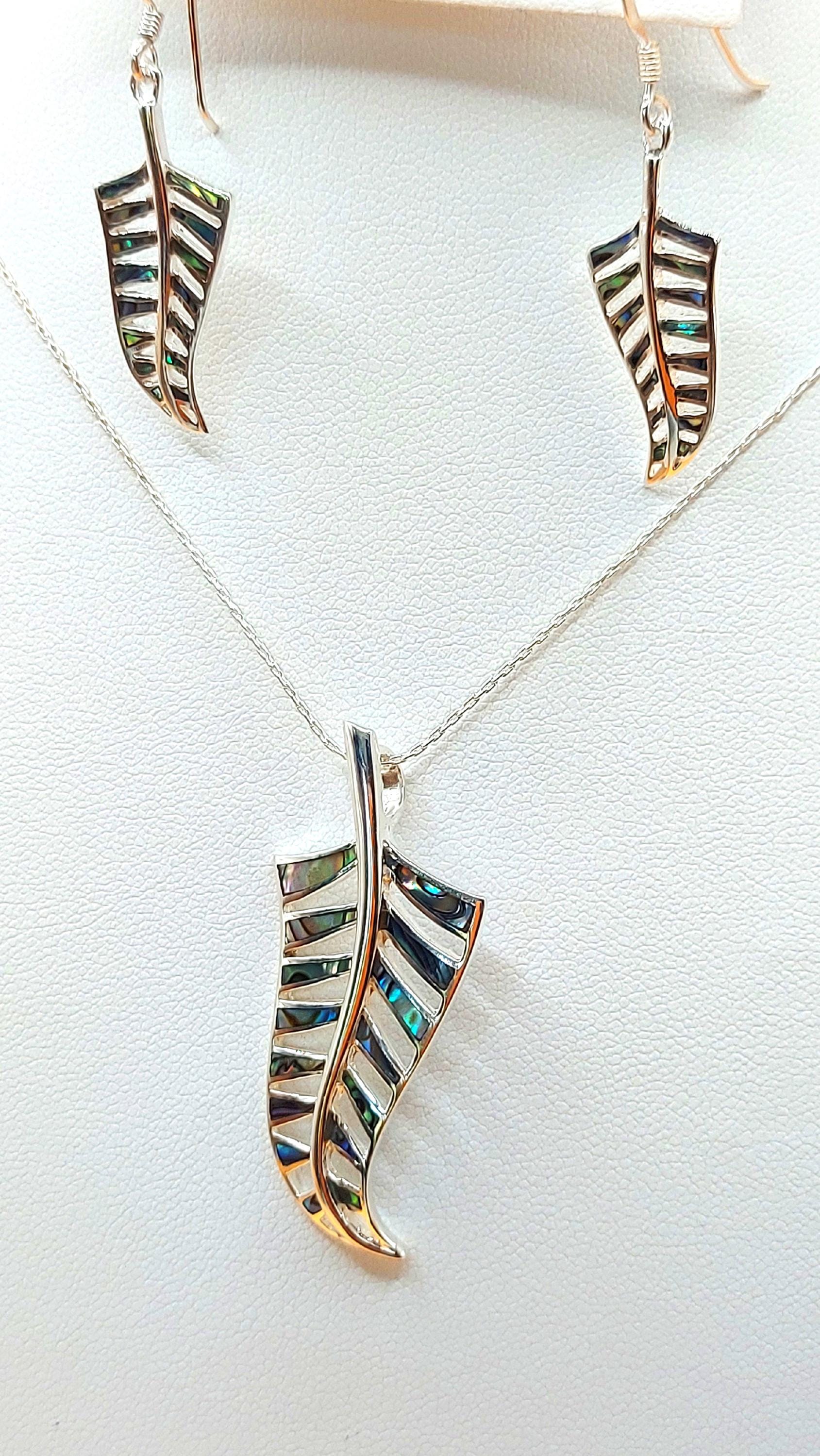 Silver Handmade Inlay Pendant/Earring Set Semi Precious Abalone Shell- Leaf