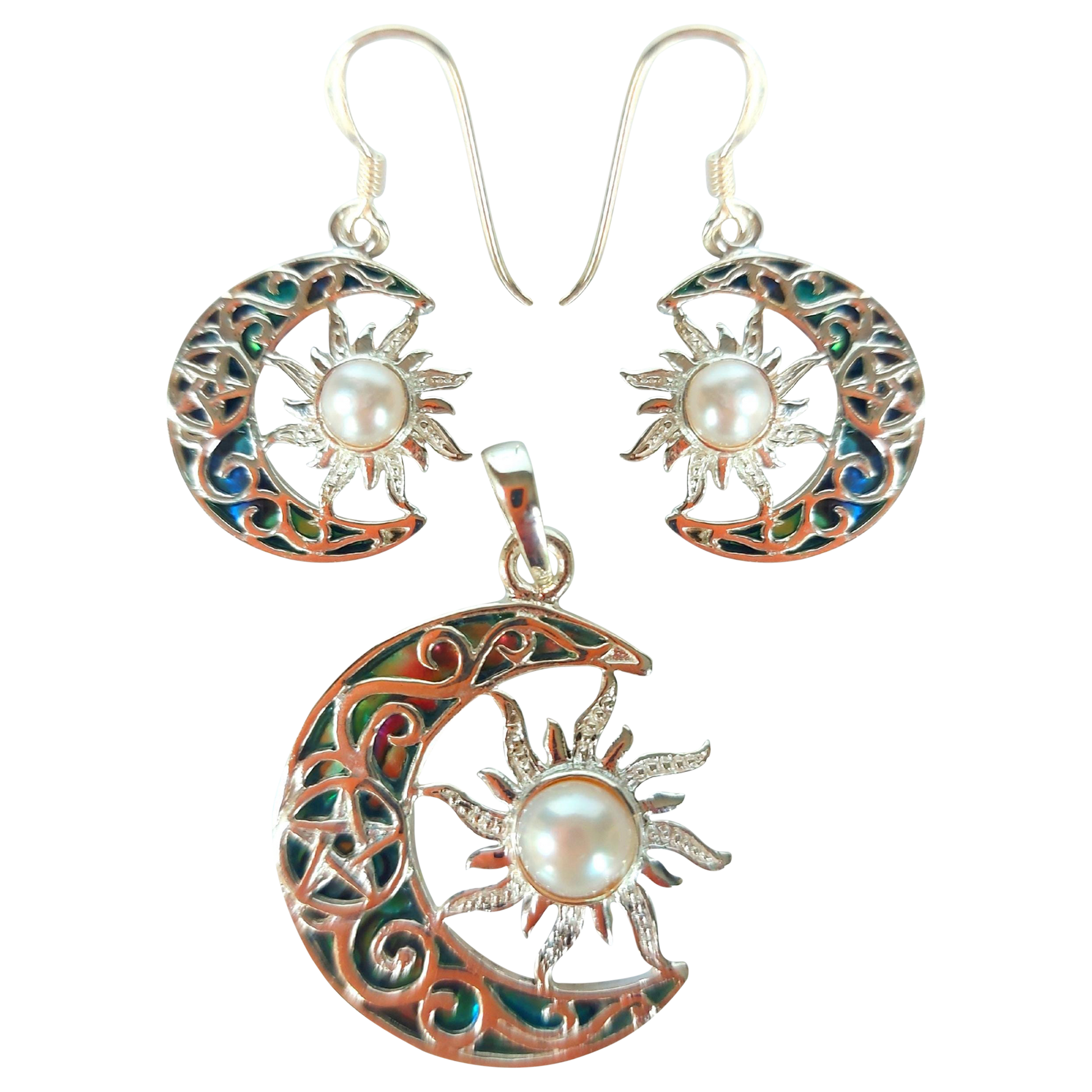 Silver Handmade Inlay Pendant/Earring Set Semi Precious Abalone Shell- Sun/Moon