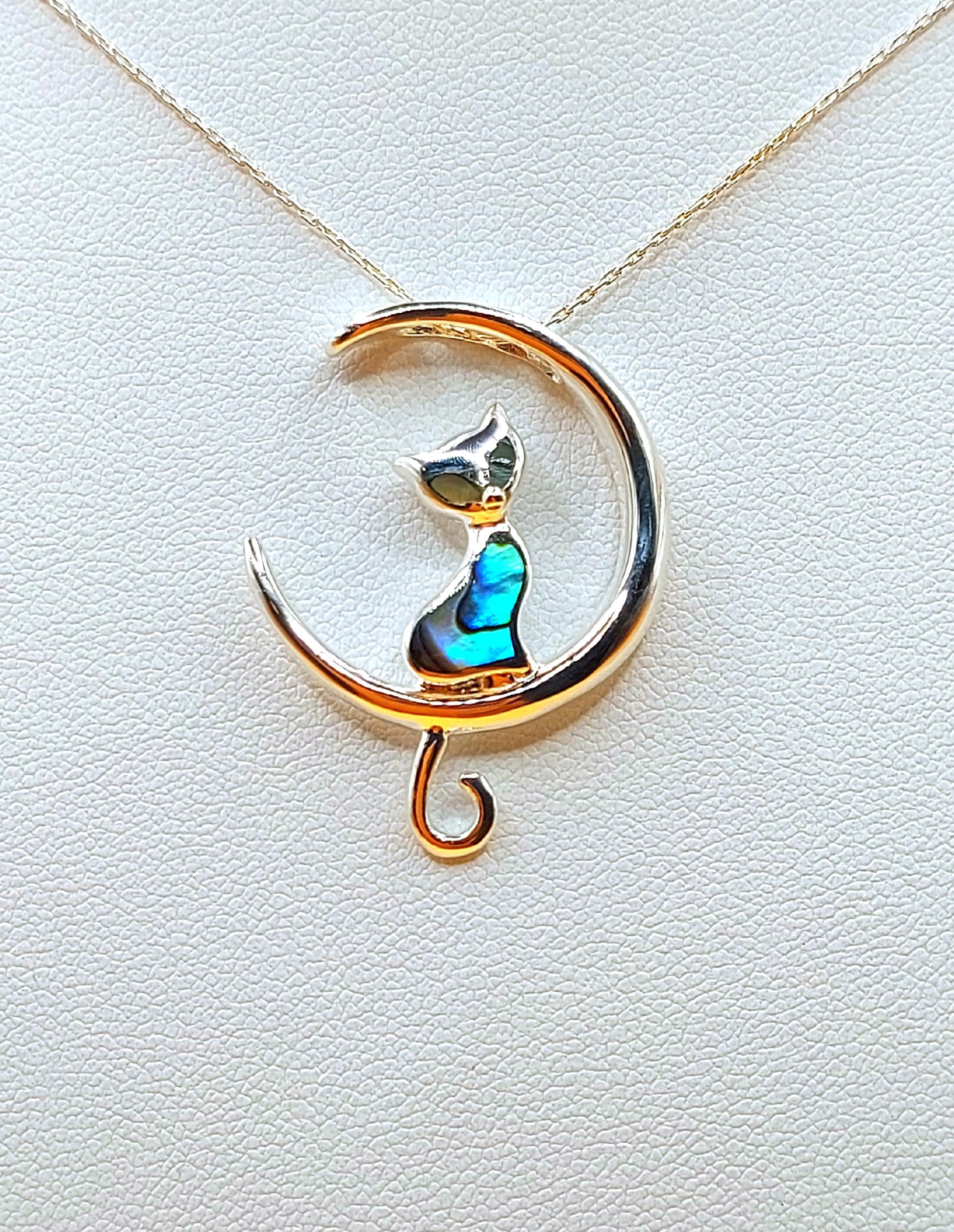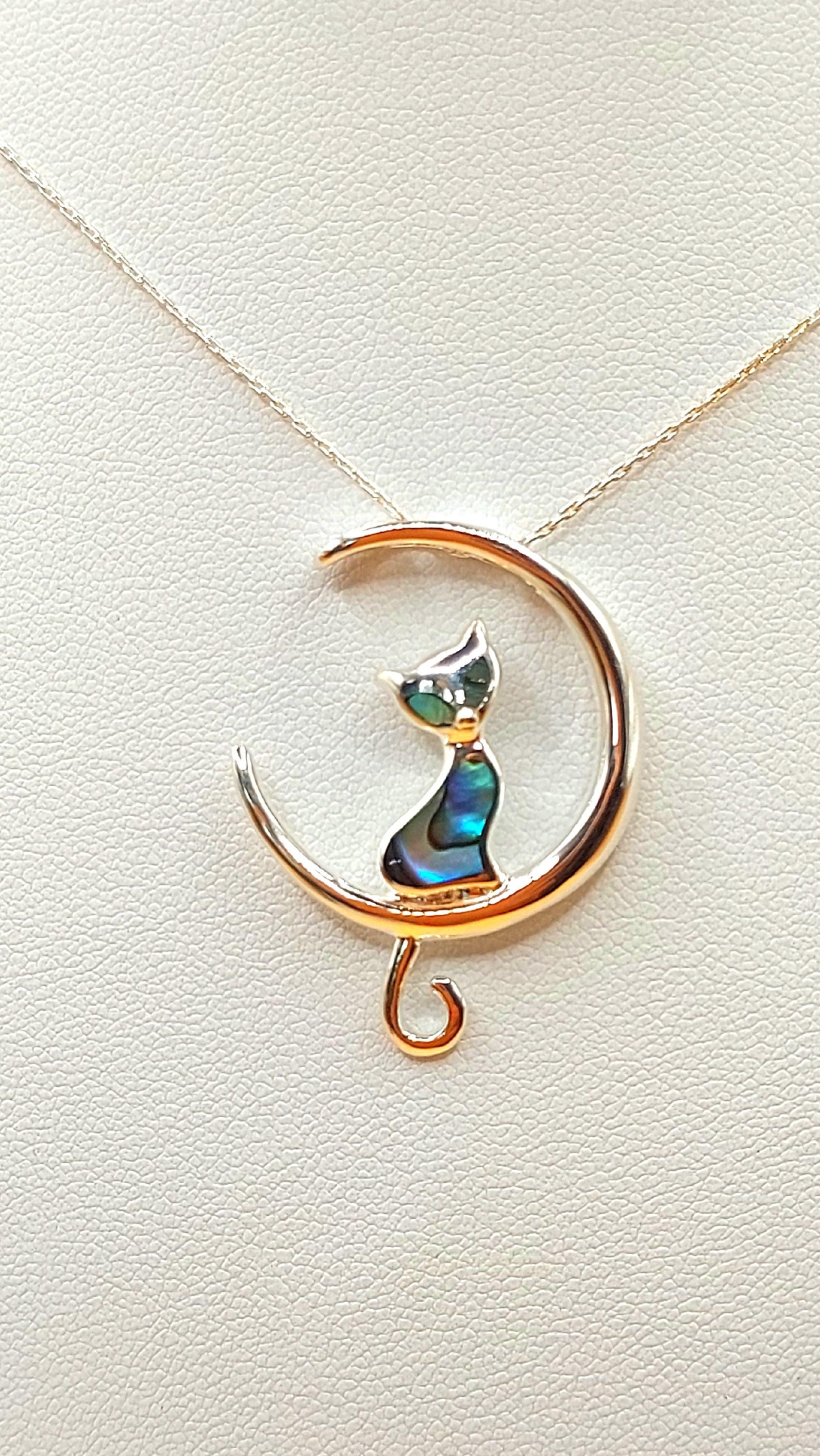 Silver Handmade Inlay Pendant Semi Precious Abalone Shell- Cat on Moon