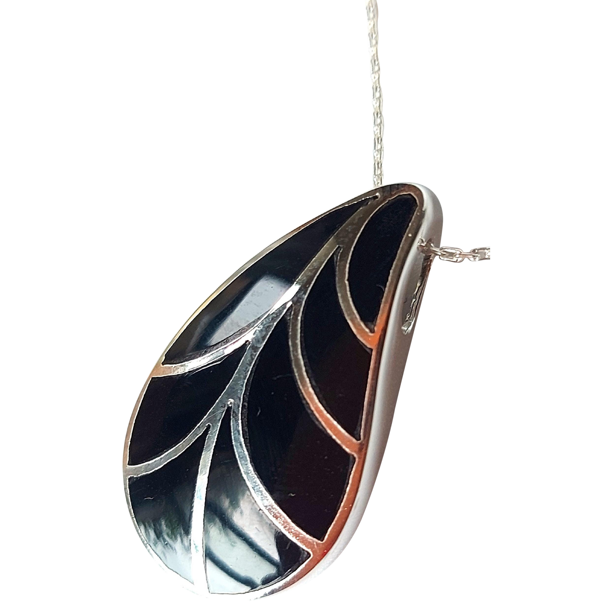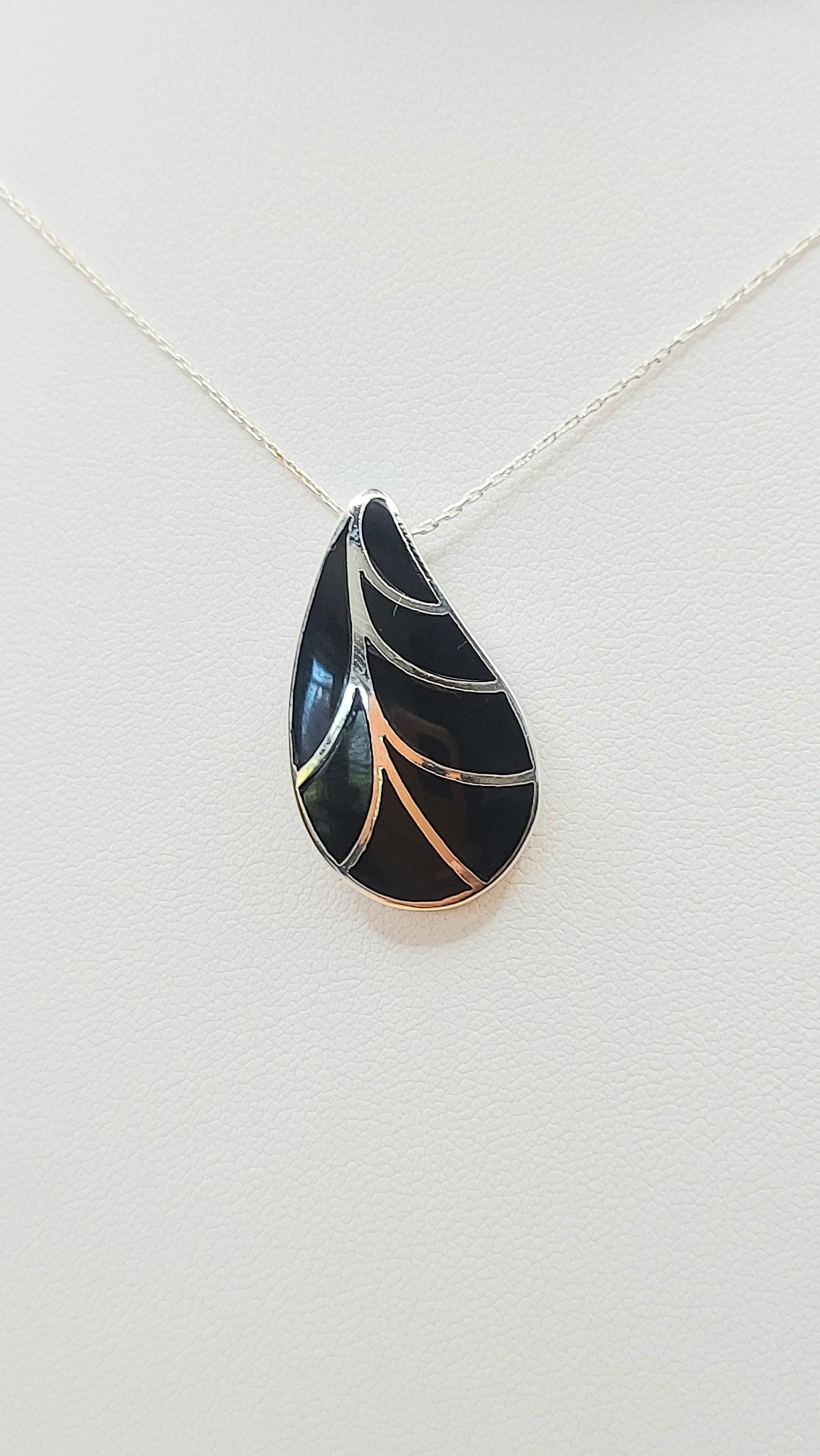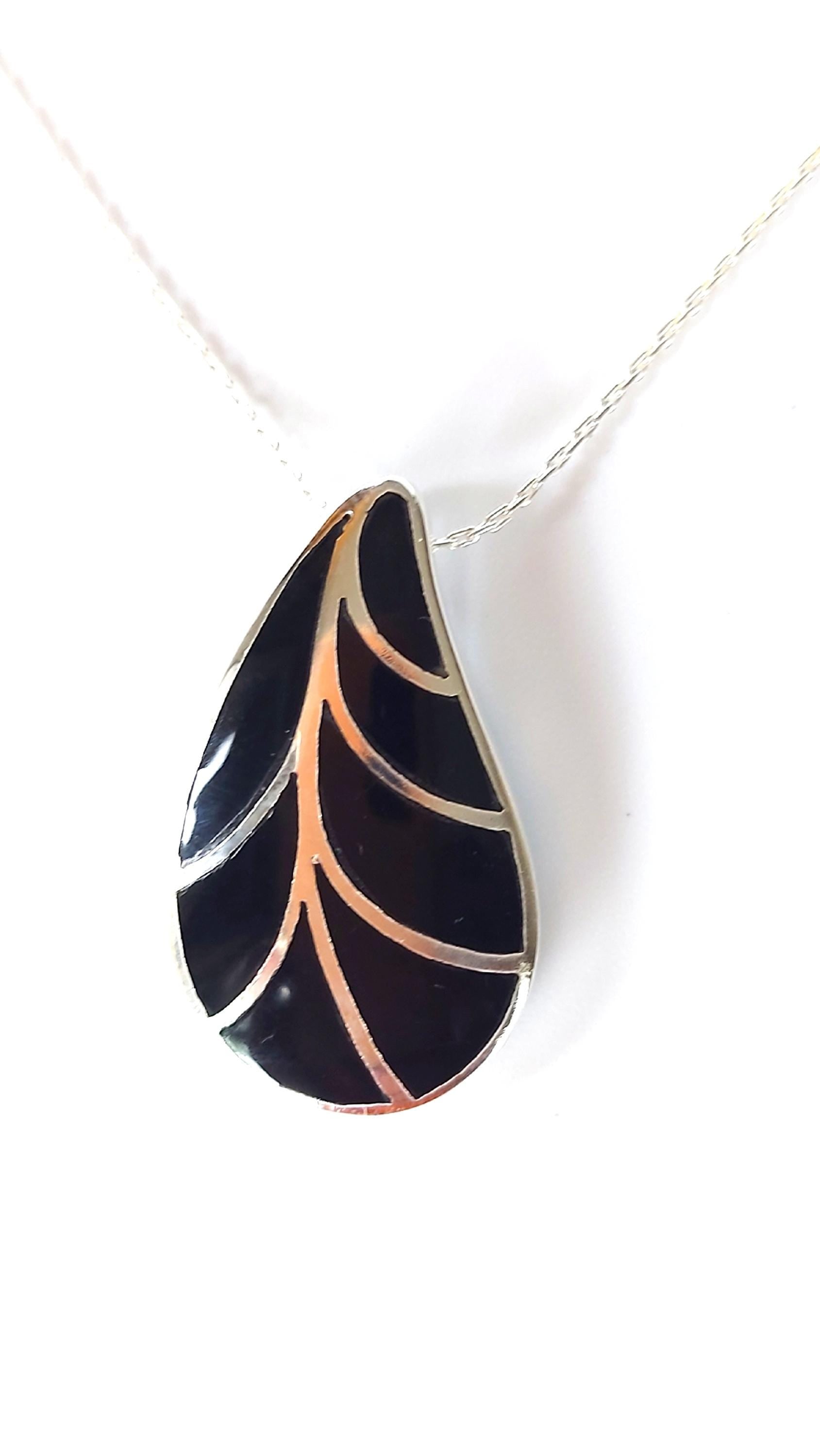 Silver Handmade Inlay Pendant Semi Precious Black Onyx- Black Leaf