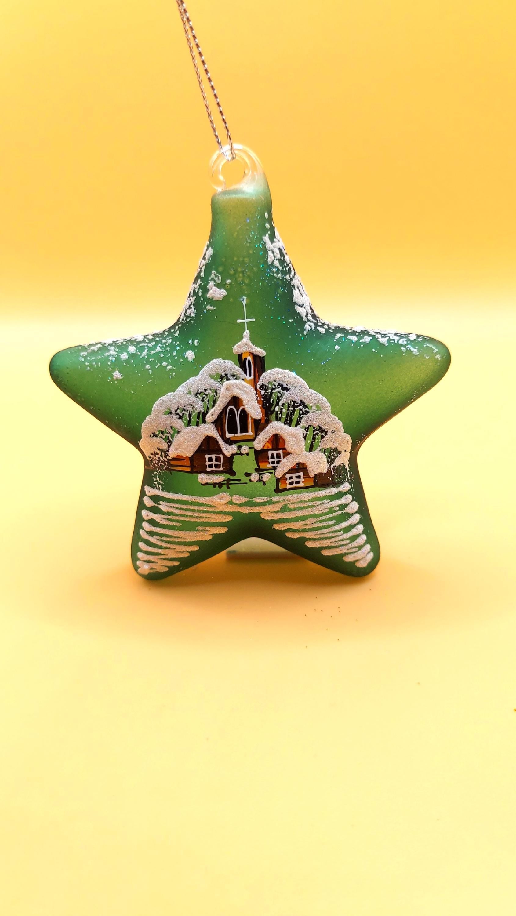 Vintage Czech Glass Christmas Ornament: Hand-Painted Green Star, House Motif