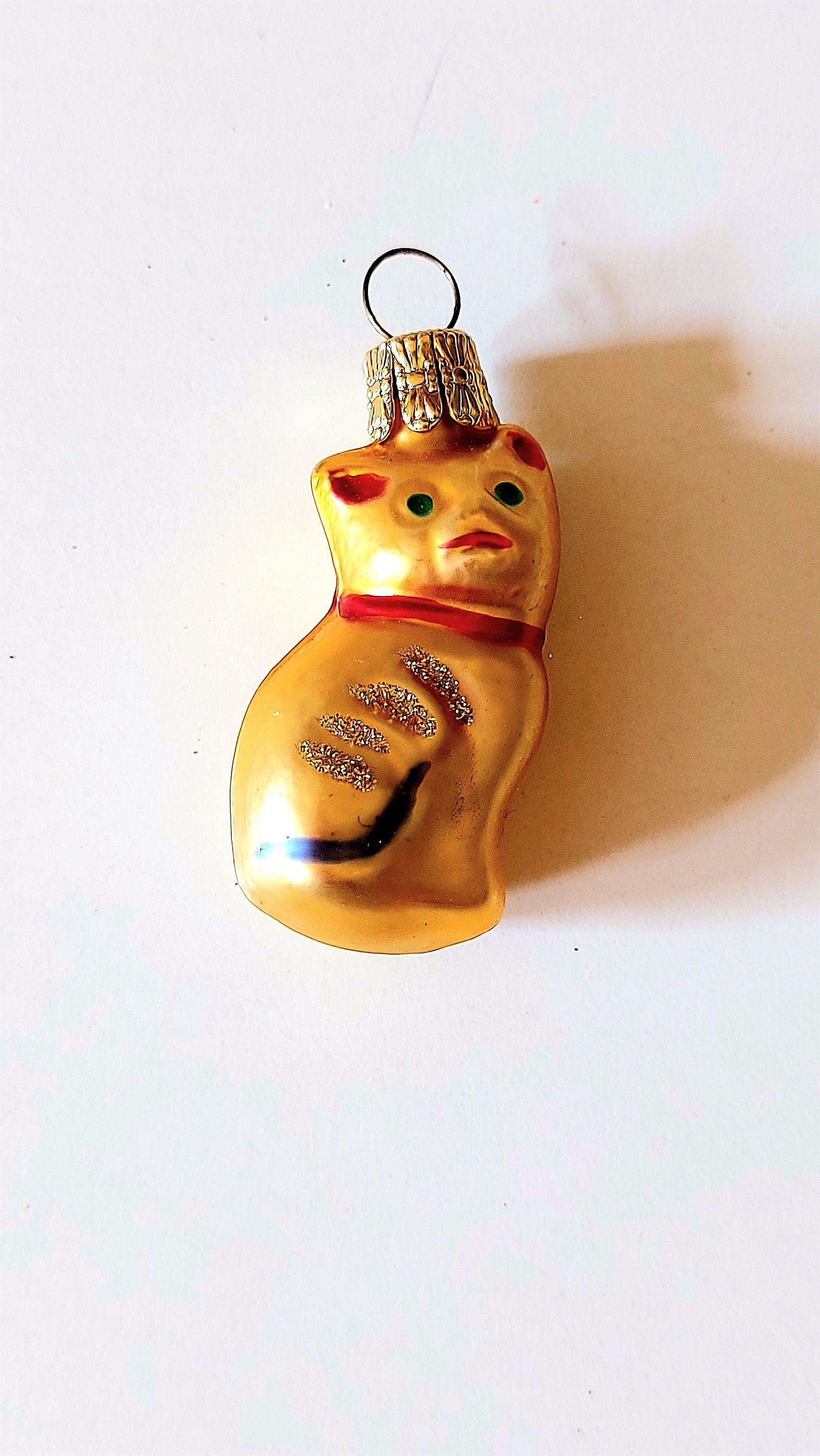 Vintage Czech Hand-Painted Glass Yellow Cat Christmas Ornament (Pair)
