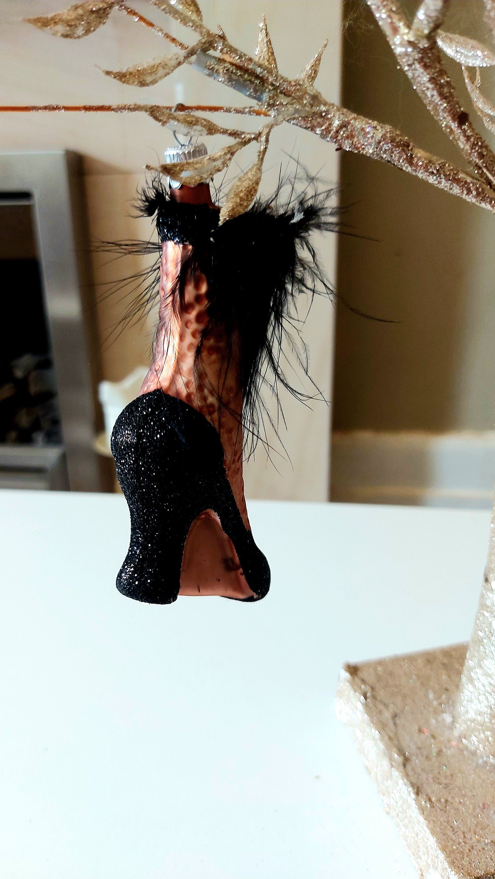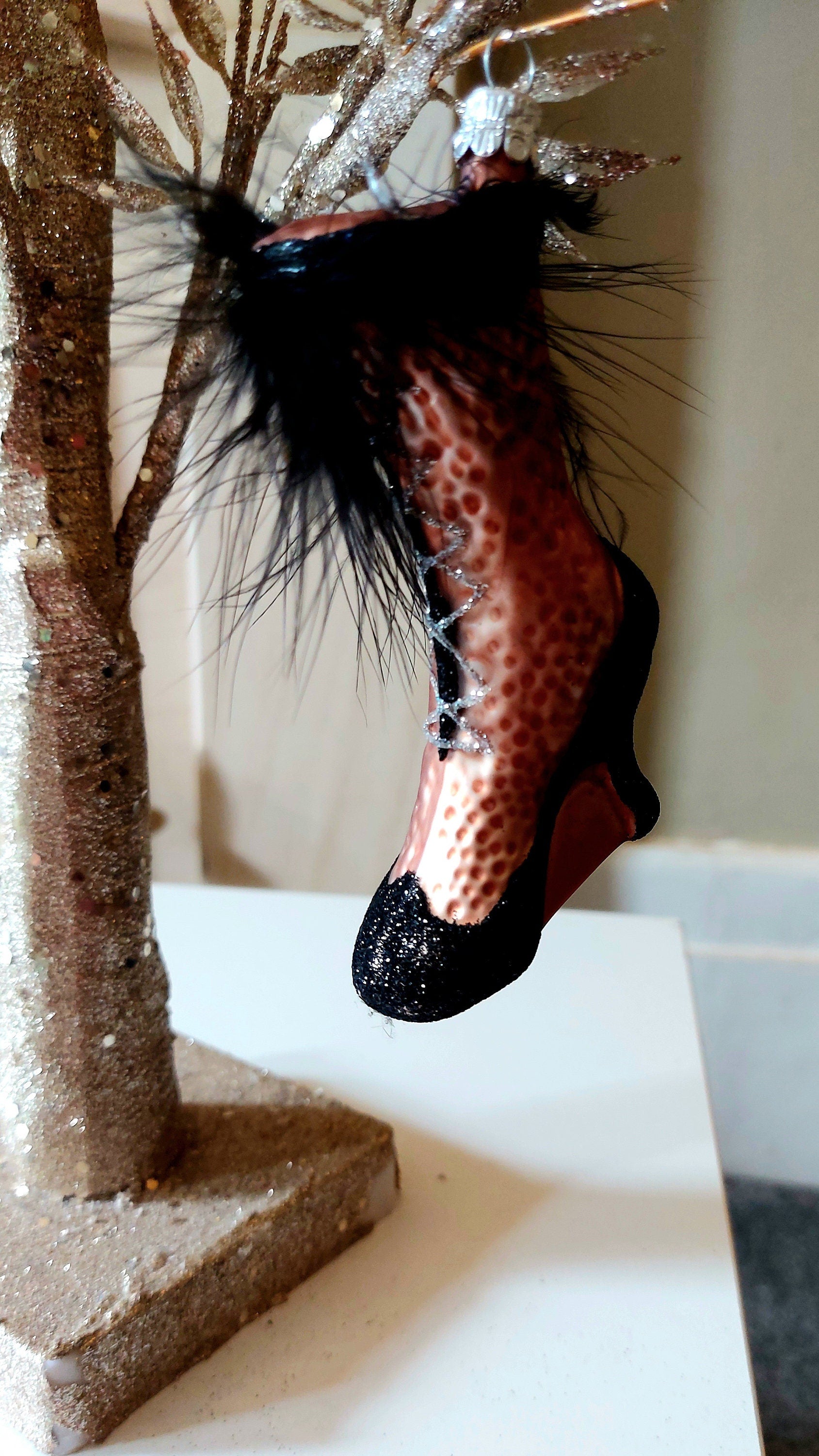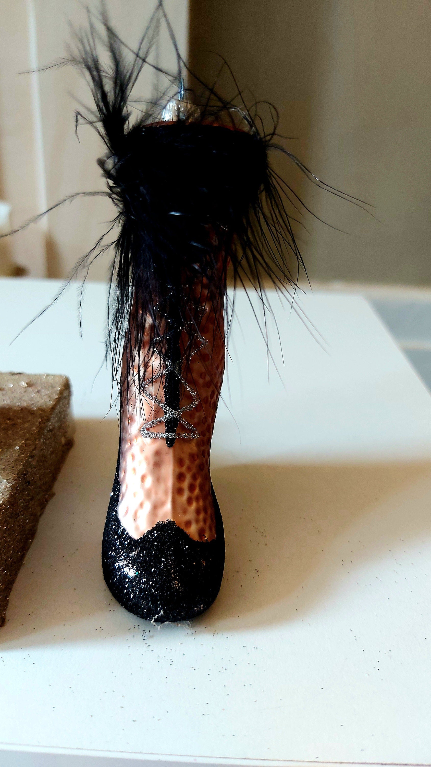 Vintage Czech Republic, Glass Blown, Hand Painted Christmas Tree Ornament - Boot Rose Gold Black