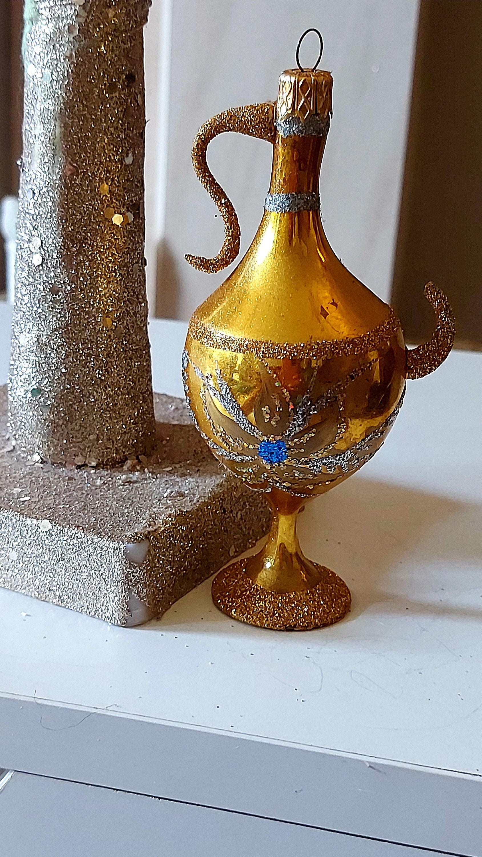 Vintage Czech Republic, Glass Blown, Hand Painted Christmas Tree Ornament - Genie Lamp gold/silver