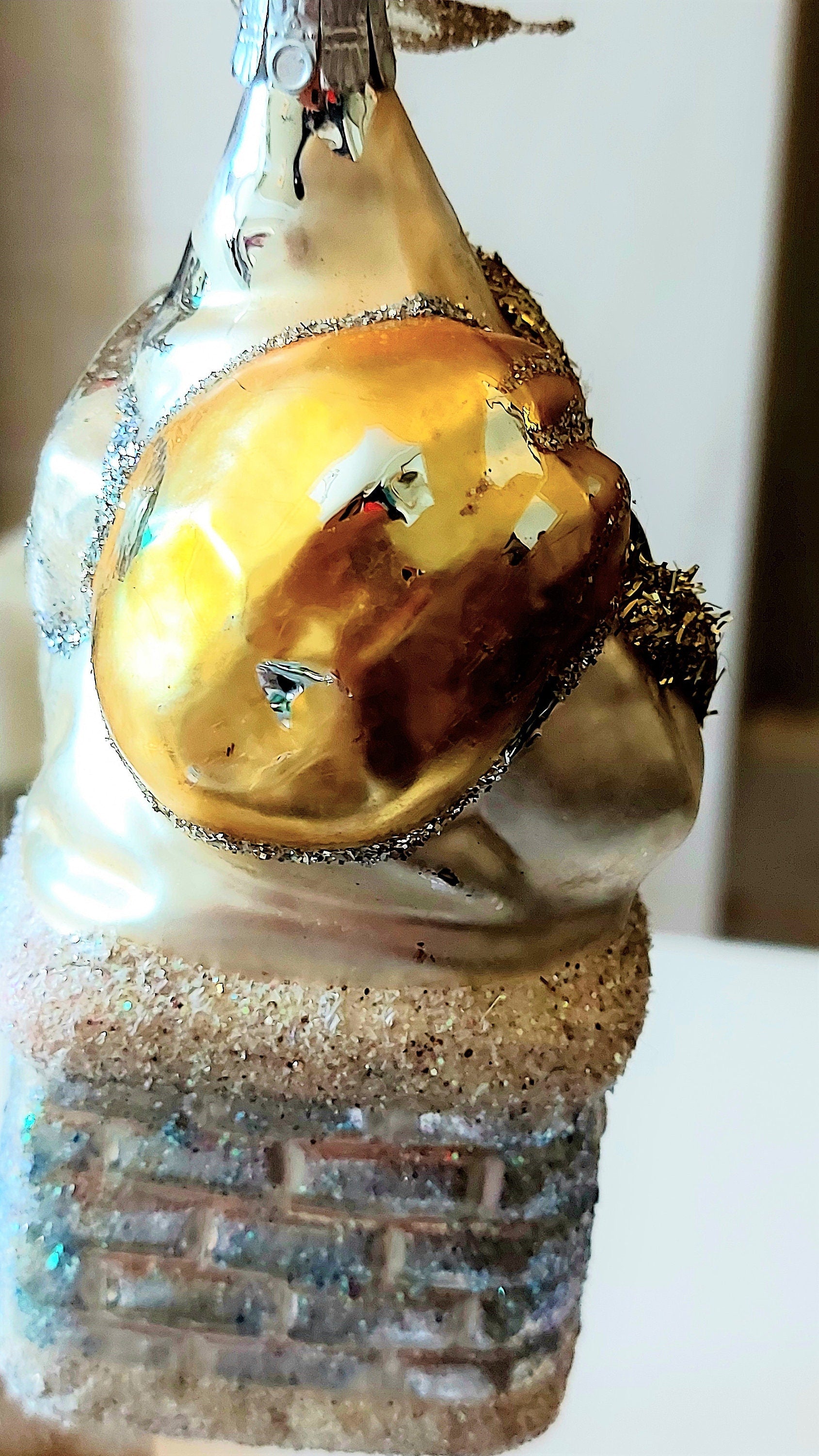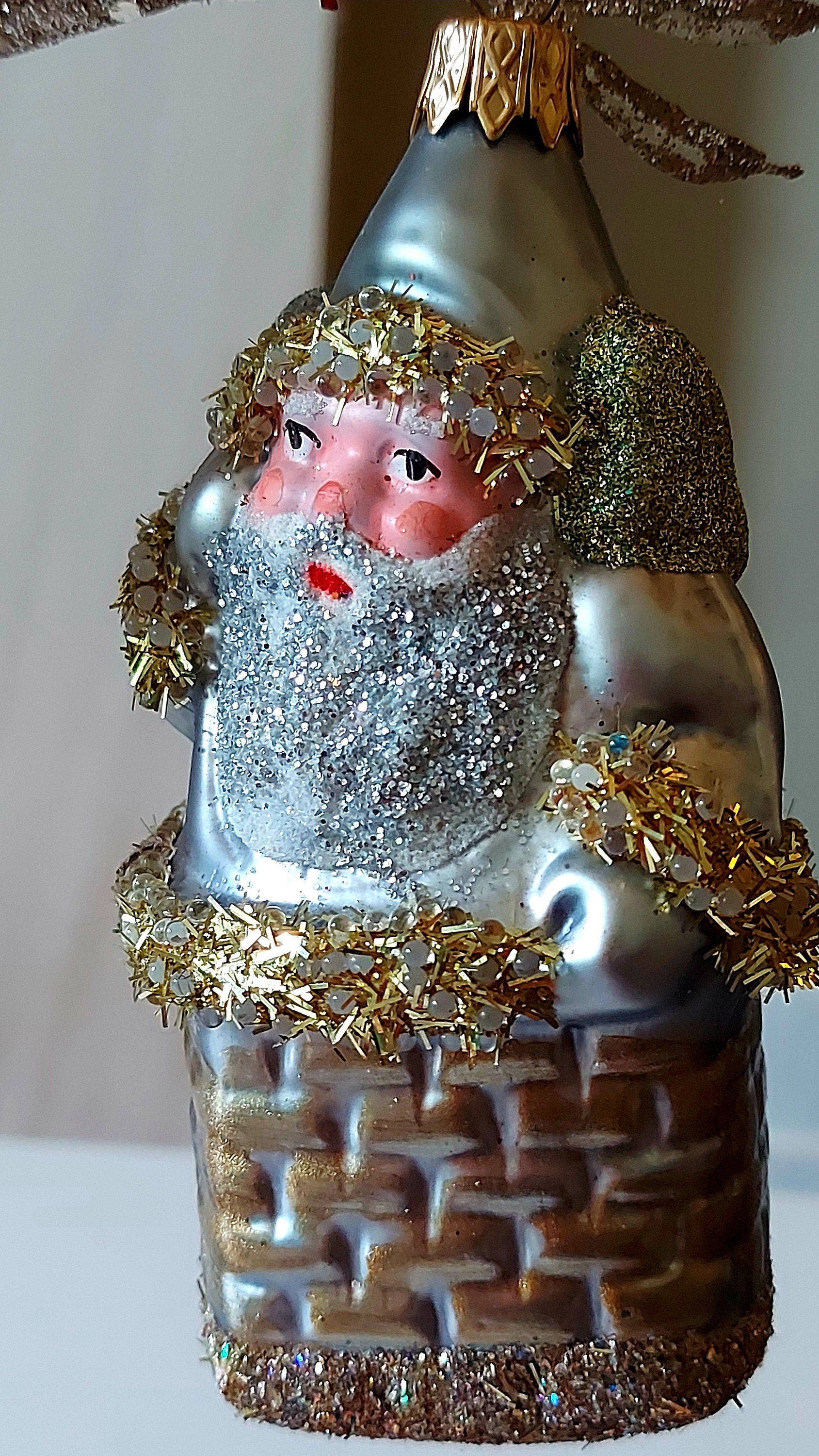 Vintage Czech Republic, Glass Blown, Hand Painted Christmas Tree Ornament - Large Santa in Chimney