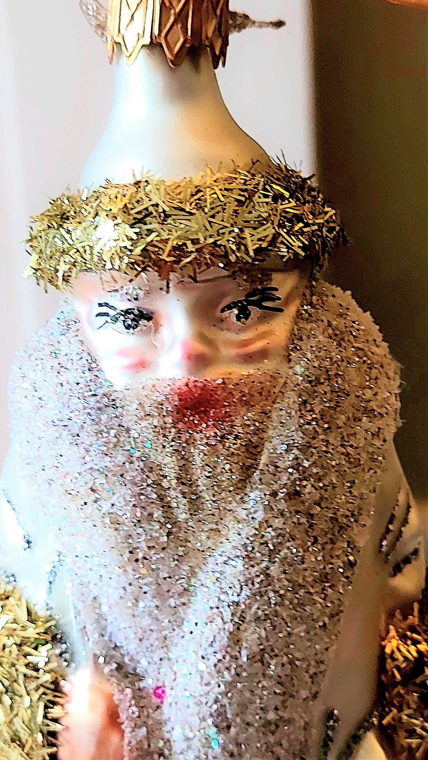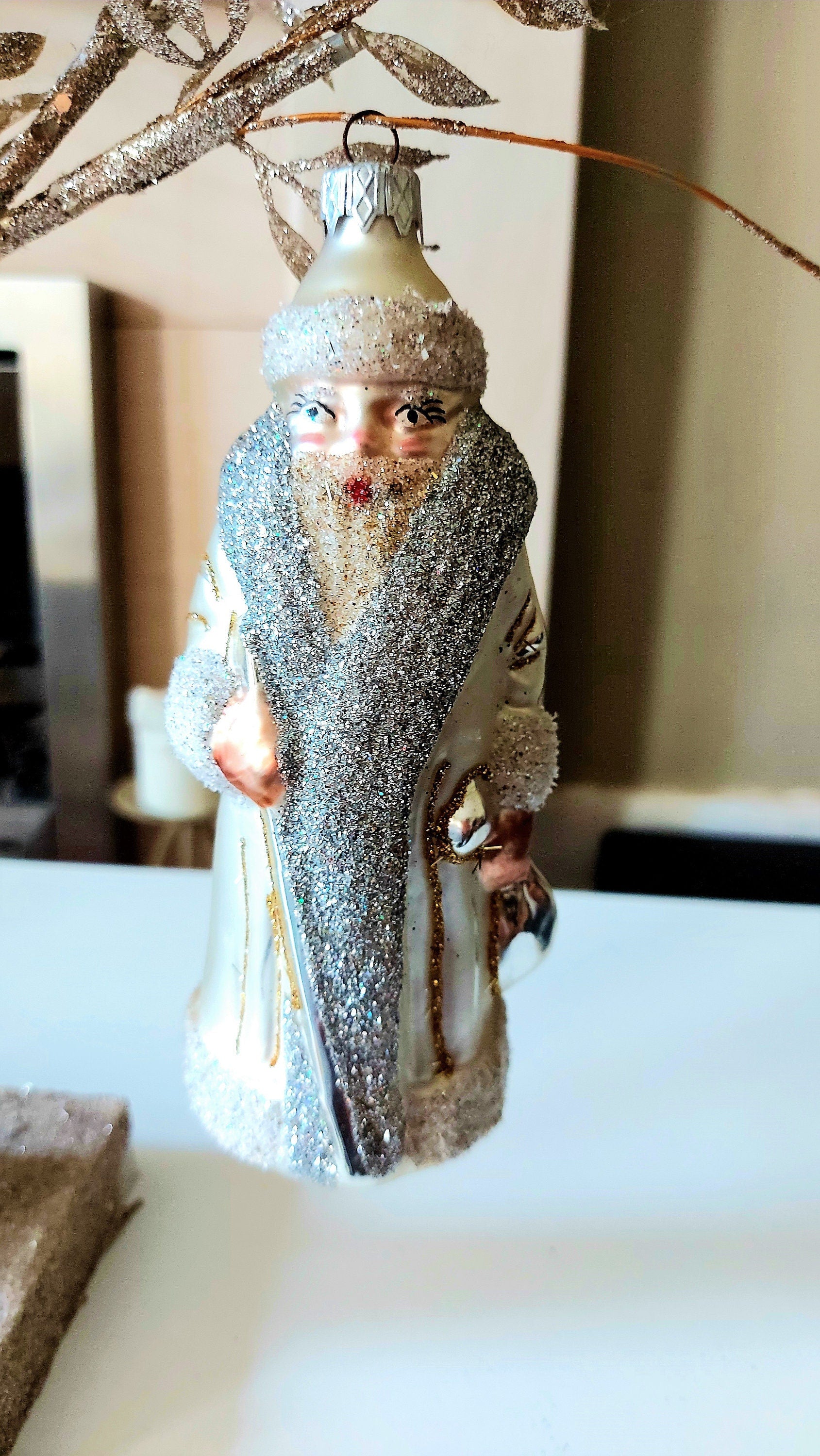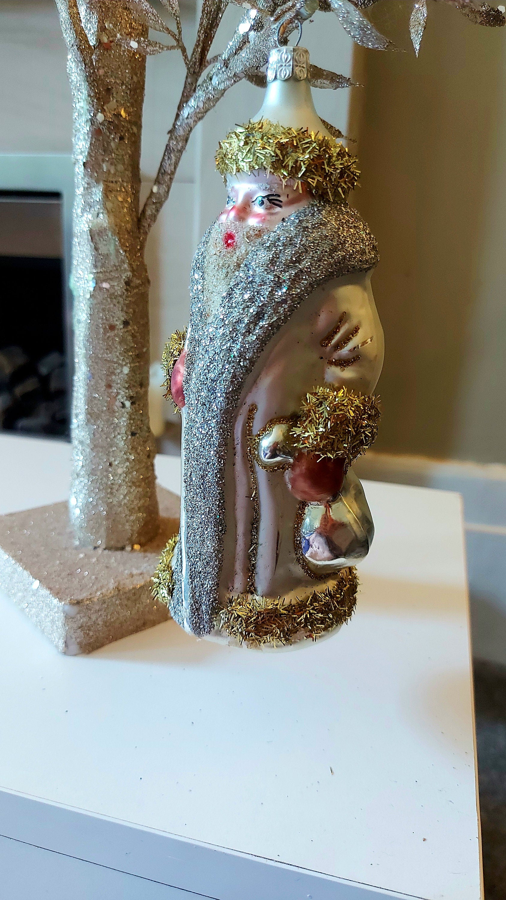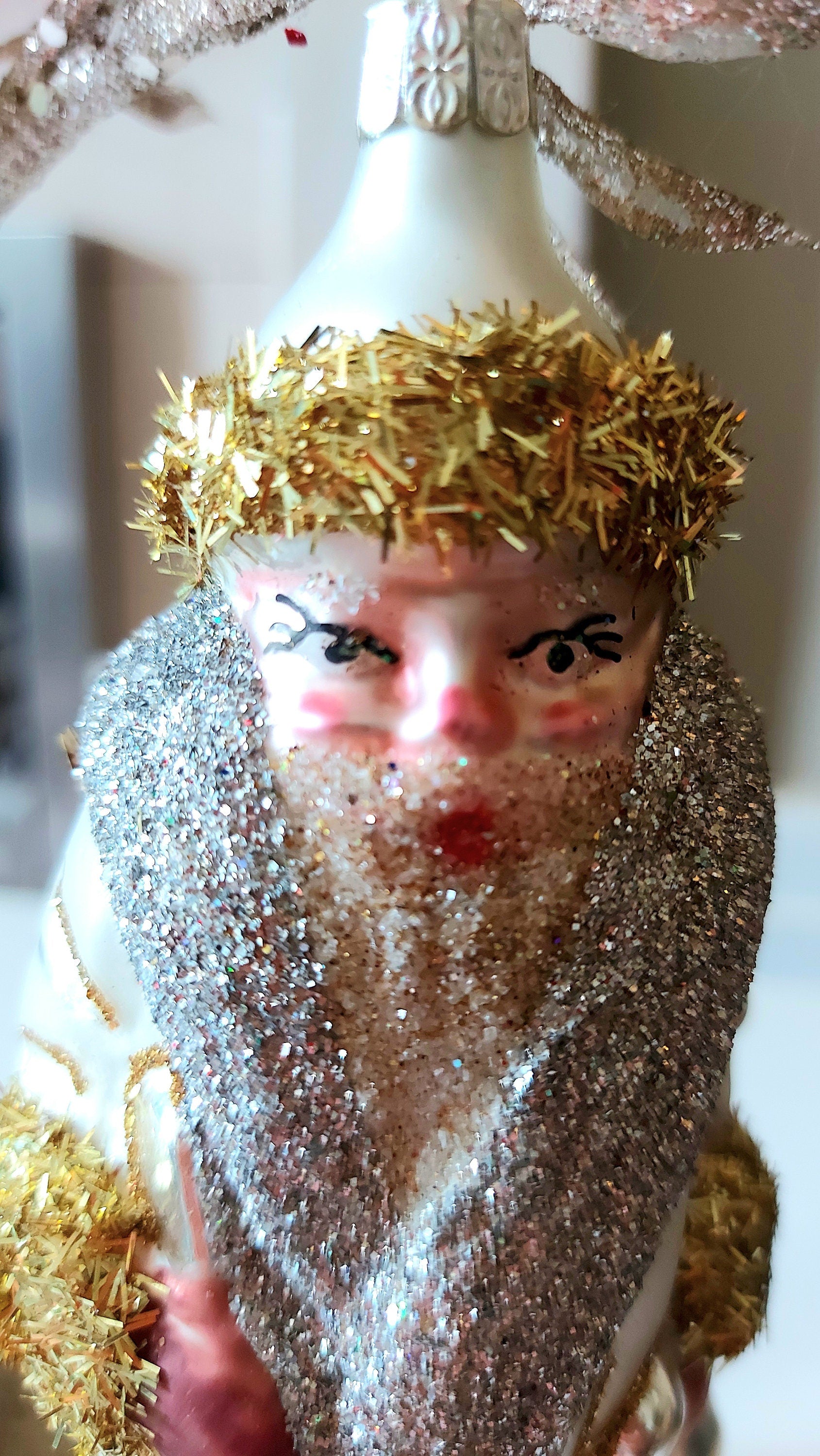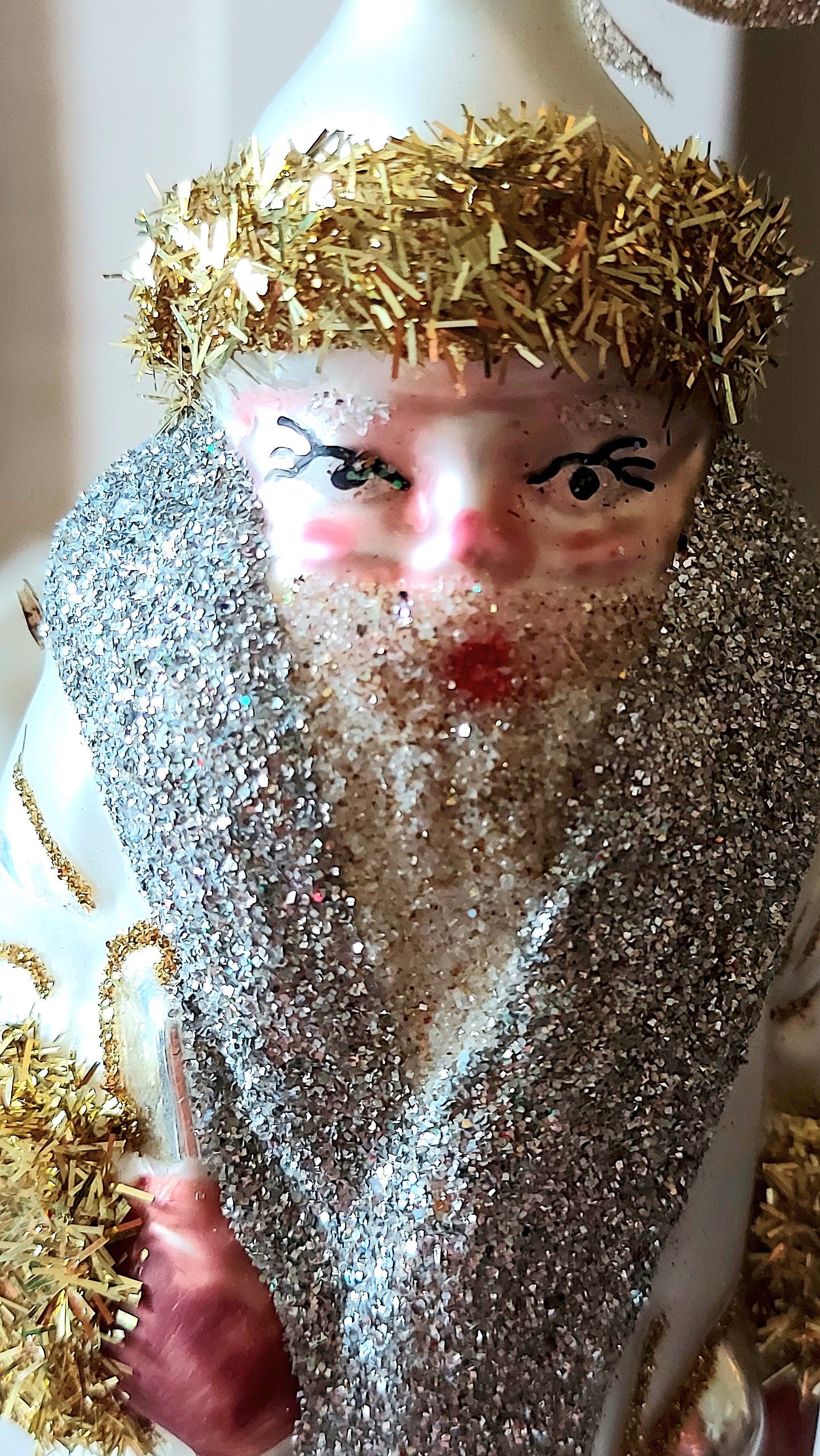 Vintage Czech Republic, Glass Blown, Hand Painted Christmas Tree Ornament - Large Santa Silver/Gold