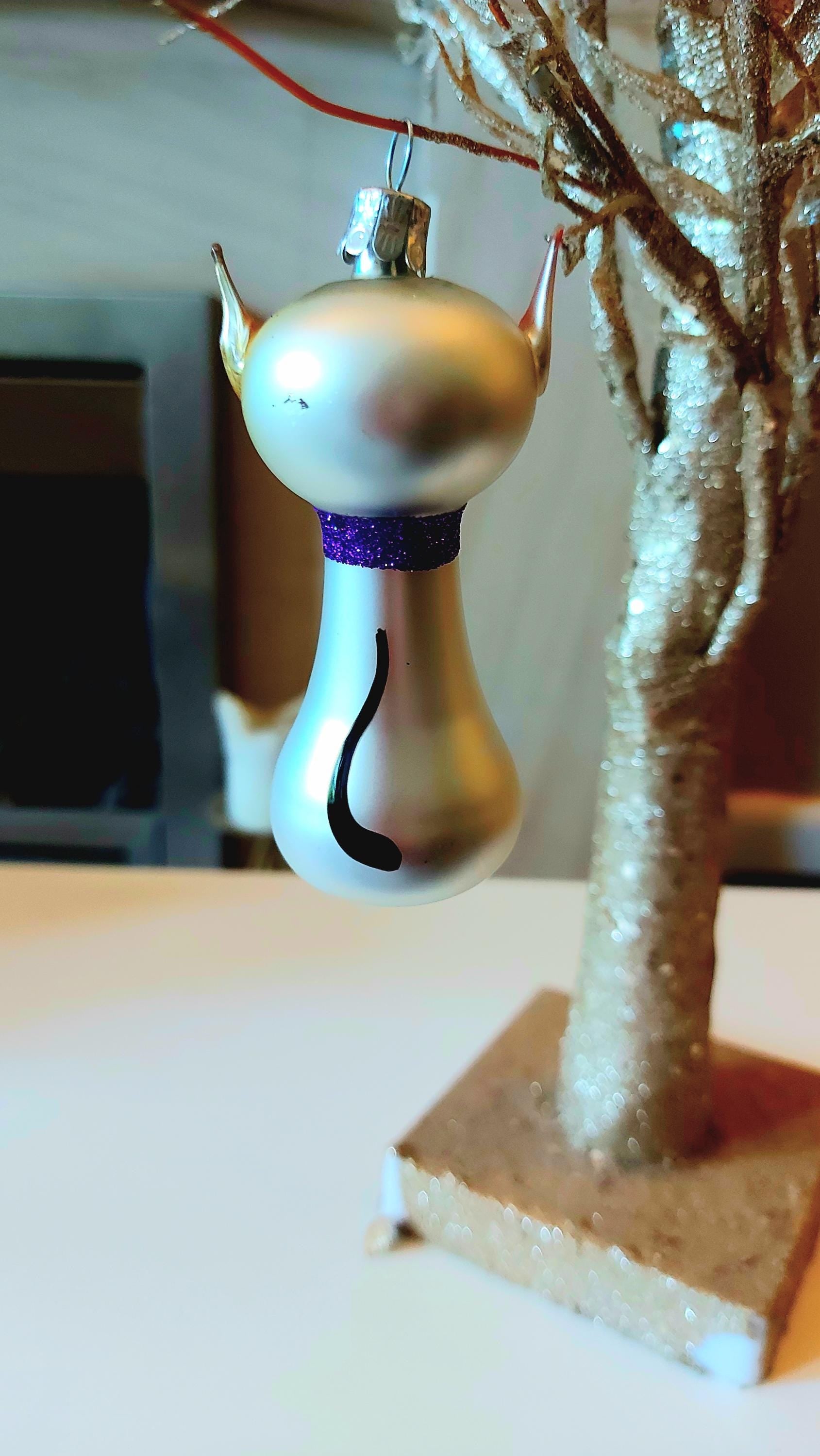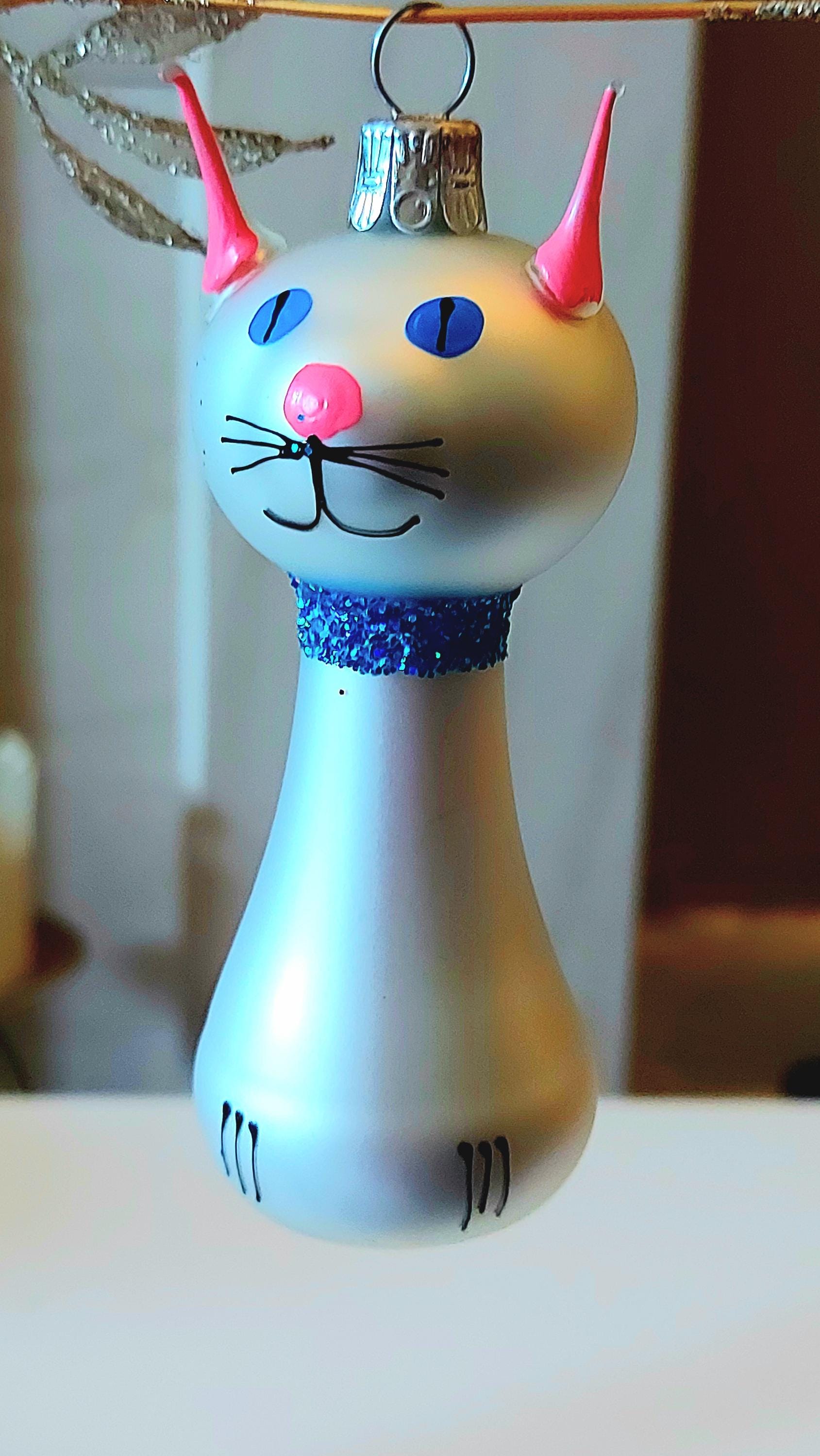 Vintage Czech Republic, Glass Blown, Hand Painted Christmas Tree Ornament - Silver Cat