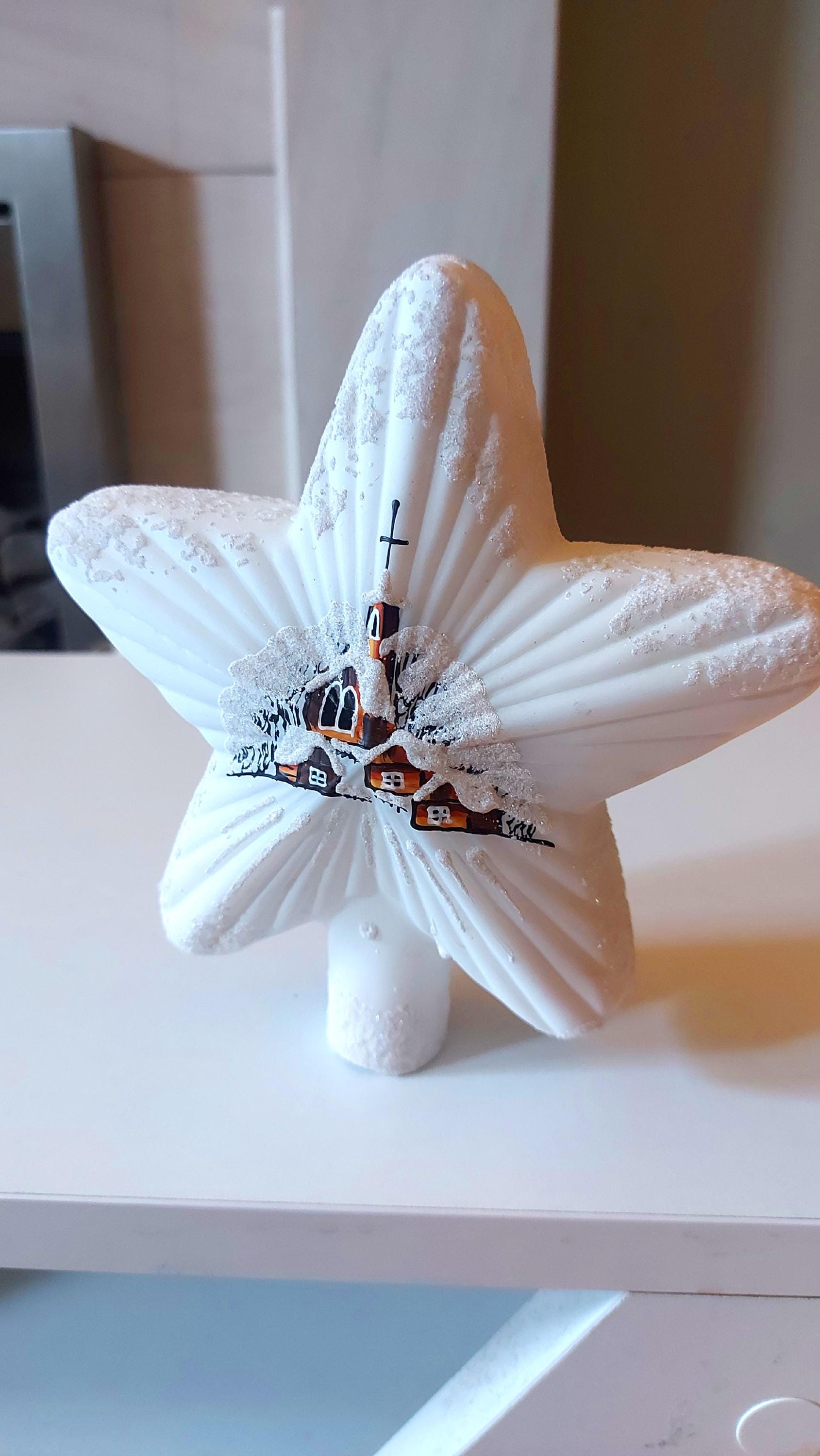 Vintage Czech Republic, Glass Blown, Hand Painted Christmas Tree Ornament - White Star Tree Topper